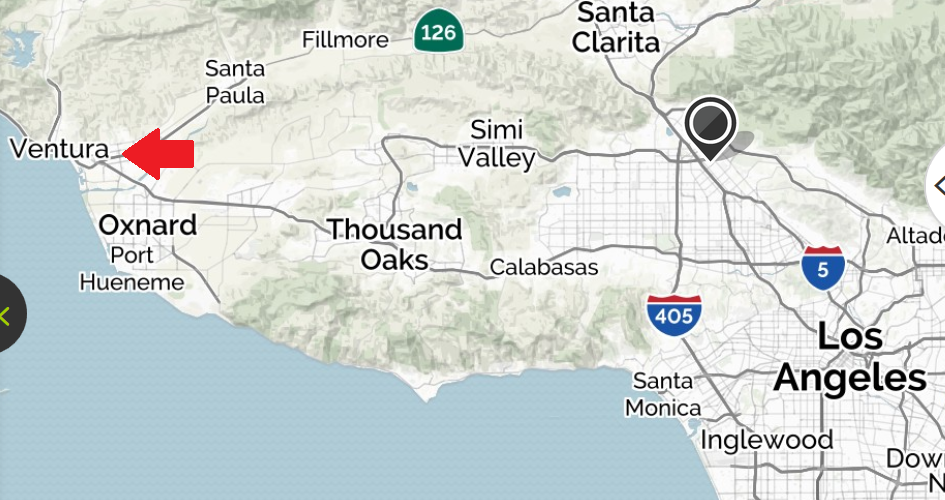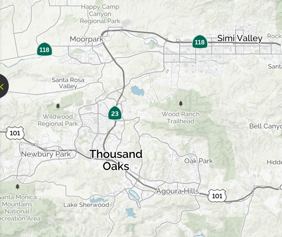 Lauren and her companions leave Highway 118 to “look for” and connect with Highway 23, headed south, with the intention of connecting with the 101, which will take them north. Lauren sees a big fire in the hills to the east.